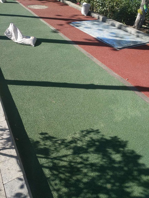 用粉筆圈出填補(bǔ)范圍,用路面涂料填補(bǔ)后刮平(用小刮刀)。(六)自行車道防滑紋施工1、使用耙子進(jìn)行施工。2、調(diào)整杷子四面高度,與地面保持平行;如果地面凹凸不平,可在杷子上蹲人,增加重量。3、在涂料里面加入細(xì)骨料(骨料加入量為20%,骨料直徑為0.8-1.5mm)進(jìn)行攪拌,攪拌均勻后加入1%-2%的固化劑進(jìn)行攪拌,攪拌均勻后直接涂敷在地面上用耙子進(jìn)行刮耙。